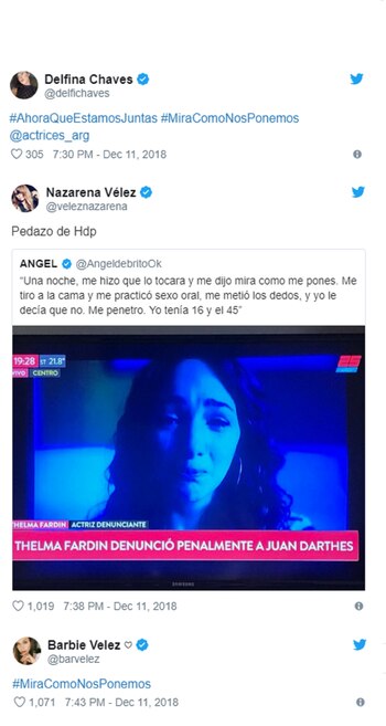 El colectivo de Actrices Argentinas se reunió en una conferencia de prensa para hacer pública la denuncia que se realizó contra Juan Darthés por violar a la actriz Thelma Fardín, en la época en la que fueron compañeros de elenco en Patito Feo.