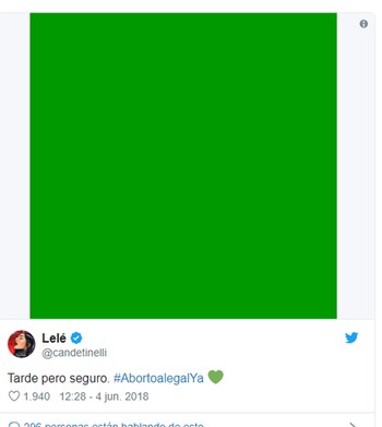 "Tarde pero seguro. Aborto Legal Ya", había escrito la hija del conductor de ShowMatch en su cuenta de Twitter, junto con una imagen de un cuadrado verde.