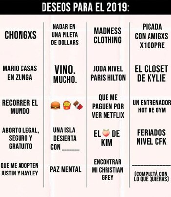 Entre los pedidos más llamativos, además de "chongos", "nadar en una pileta llena de dólares" y "mucho vino", la flamante cantante aprovechó para pedir más días de descanso: "Feriados nivel CFK".