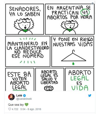 El 8 de agosto, previo a que la Cámara Alta rechazara el proyecto, Cande había realizado un posteo en Instagram con el título "Que sea ley", junto con una historieta en la que explicaba que la clandestinidad de la práctica no reducía la cantidad de abortos y cerraba: "El aborto legal es vida".