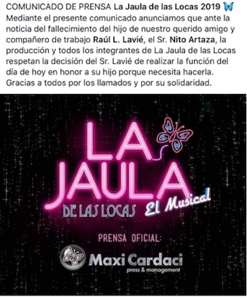 La producción del espectáculo, a través de su jefe de prensa Maxi Cardaci, informó: "Mediante el presente comunicado anunciamos que ante la noticia del fallecimiento del hijo de nuestro querido amigo y compañero de trabajo Raúl L. Lavié, el Sr. Nito Artaza, la producción y todos los integrantes de La Jaula de las Locas respetan la decisión del Sr. Lavié de realizar la función del día de hoy en honor a su hijo porque necesita hacerla. Gracias a todos por los llamados y por su solidaridad".
