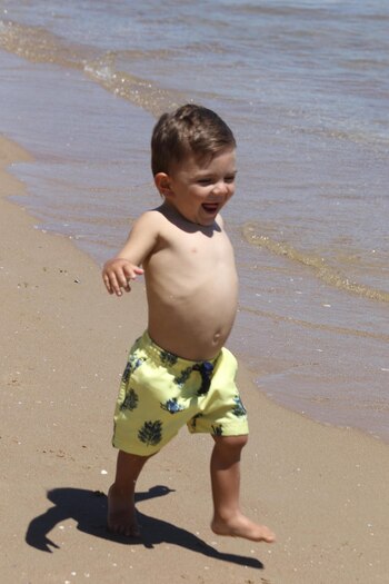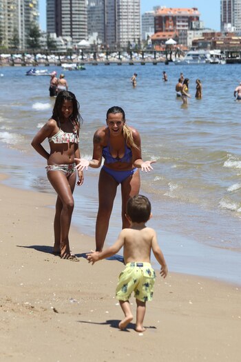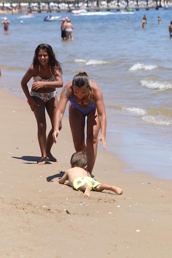 La periodista lució una bikini lila y se mostró todo el tiempo muy sonriente, de la mano con su hija mayor y acompañando a Roque en sus primeros pasos en la arena. A pesar de que tuvo más de una caída, el pequeño se lo tomó con mucho humor y no paró de jugar.