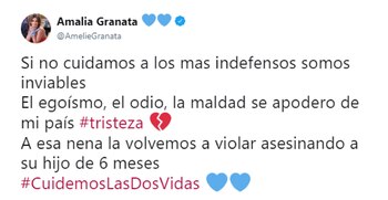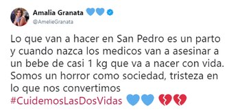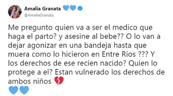 "Si no cuidamos a los más indefensos somos inviables. El egoísmo, el odio, la maldad se apodero de mi país. A esa nena la volvemos a violar asesinando a su hijo de seis meses. Lo que van a hacer en San Pedro es un parto y cuando nazca los médicos van a asesinar a un bebé de casi un kilo que va a nacer con vida. Somos un horror como sociedad, tristeza en lo que nos convertimos", continuó Granata en la red social.