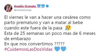 La periodista se expresó a través de las redes sociales y dejó su postura a favor de las dos vidas y en contra del aborto. "El viernes le van a hacer una cesárea como parto prematuro y van a matar al bebé cuando esté fuera de la panza. Está de un poco más de seis meses de embarazo. ¿En qué nos convertimos? #CuidemosLasDosVidas", escribió en su cuenta de Twitter, red social en la que tiene más de dos millones de seguidores.