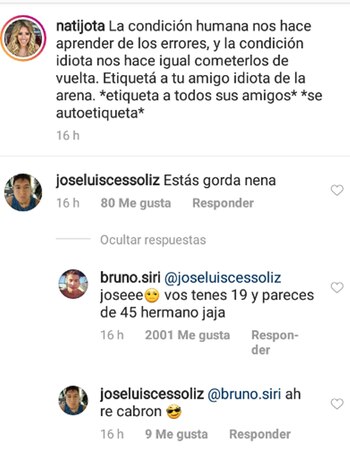 Sin dudarlo, Bruno Siri, el novio de la conductora de ESPN desde hace poco más de un año, utilizó la red social para defenderla: "Vos tenés 19 y parecés de 45 hermano, ja".
