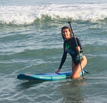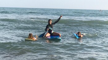 "Sobre todo disfruto eso, compartir tiempo con ellos. Nos divertimos con las olas, porque imaginate, yo estoy recién comenzando, así que son más caídas y golpes que otra cosa, se matan de la risa, no pueden creer los golpazos que me doy", explicó entre risas.