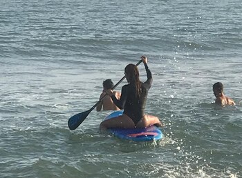 Es que más allá que aquí también el público le ha respondido muy bien a Bien Argentino, la obra que protagoniza junto a Miguel Ángel Cherutti, también ha encontrado en estas playas una pasión que comparte junto a sus hijos, Paul e Isabella: el paddle surf.