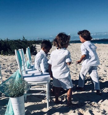 Tanto el novio como Pampita compartieron varias fotos del viaje en las que entre otras cosas, se ve a los tres hijos de la modelo con Benjamín Vicuña muy divertidos jugando en la playa vestidos completamente de blanco.