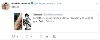 "Belleza", dijo Lamothe después de que alguien en las redes se refiriera a los tatuajes que se hizo en estos últimos días: "Lamothe se quiso tatuar a Manny Pacquaio y se tatuó al gran Pedro Décima".