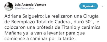 "Adriana Salgueiro: Le realizaron una Cirugía de Reemplazo Total de Cadera, duró 50', le colocaron una prótesis de Titanio y cerámica. Mañana ya la van a levantar para que comience a caminar por la tarde", expresó el periodista en su cuenta de Twitter.