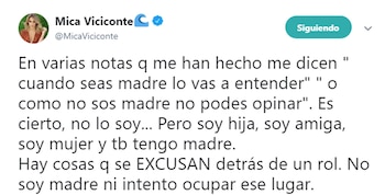 "En varias notas que me han hecho me dicen 'cuando seas madre, lo vas a entender', o 'como no sos madre, no podés opinar'. Es cierto, no lo soy… Pero soy hija, soy amiga, soy mujer y también tengo madre. Hay cosas que se EXCUSAN detrás de un rol. No soy madre, ni intento ocupar ese lugar", expresó, en forma contundente.