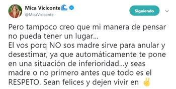 "Pero tampoco creo que mi manera de pensar no pueda tener un lugar… El 'vos porque NO sos madre' sirve para anular y desestimar, ya que automáticamente te pone en una situación de inferioridad… Y seas madre o no, primero antes que todo es el RESPETO. Sean felices y dejen vivir en paz", agregó, fiel a su estilo.