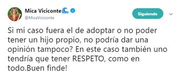 "Si mi caso fuera el de adoptar o no poder tener un hijo propio, ¿no podría dar una opinión tampoco? En este caso también uno tendría que tener RESPETO, como en todo. ¡Buen finde!", concluyó la ex participante del Bailando.