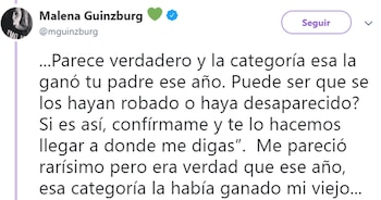 "'Parece verdadero y la categoría esa la ganó tu padre ese año. ¿Puede ser que se lo hayan robado o haya desaparecido? Si es así, confirmame y te lo hacemos llegar a donde me digas'. Me pareció rarísimo pero era verdad que ese año, esa categoría la había ganado mi viejo…", siguió una de las integrantes de Basta de Todo, el ciclo que conduce Matías Martin por Radio Metro.