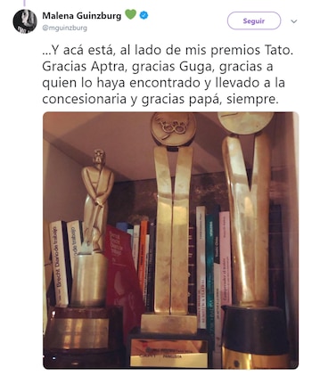 "Y acá está, al lado de mis premios Tato. Gracias Aptra, gracias Guga, gracias a quien lo haya encontrado y llevado a la concesionaria. Y gracias papá, siempre", concluyó orgullosa y emocionada, mostrando la biblioteca donde luce ahora el premio más importante de la televisión argentina.