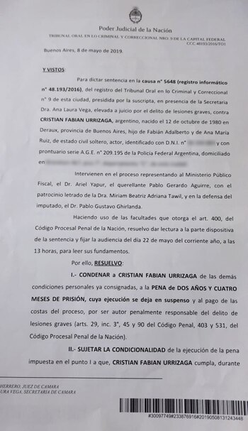 El ex Combate fue condenado a dos años y cuatro meses de prisión en suspenso por el Tribunal Oral en lo Criminal y Correccional N° 9 de la Ciudad de Buenos Aires por lesiones graves.