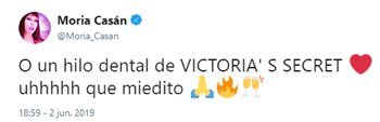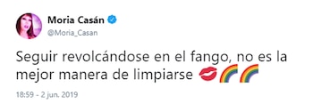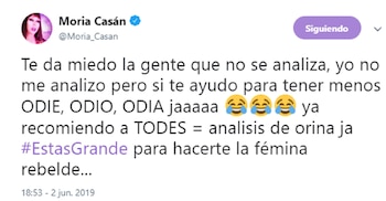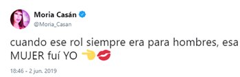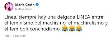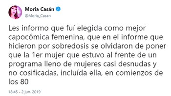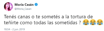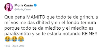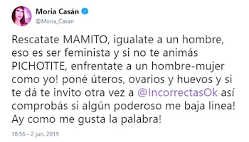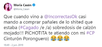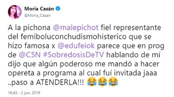 Luego de escuchar las palabras de la humorista, la conductora de Incorrectas le dedicó un fuerte mensaje a través de su cuenta de Twitter, en la que tiene casi tres millones de seguidores. "A la pichona @malepichot, fiel representante del femiboluconchudismohistérico (sic) que se hizo famosa por Eduardo Feinmann, parece que hablando de mí dijo que algún poderoso me mandó a hacer opereta al programa al cual fui invitada. jaaa, Paso a atenderla", fue el primer mensaje que escribió Moria Casán para luego comenzar una catarata de tuits sobre la humorista.