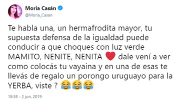 Moria también se definió como una "hermafrodita mayor" y continuó con su opinión y sus ironías sobre Malena Pichot: "Tu supuesta defensa de la igualdad puede conducir a que choques con luz verde, mamito (sic), nenite (sic), nenita. Dale, vení a ver cómo colocás tu vayaina (sic) y en una de esas te llevás de regalo un porongo uruguayo para la yerba, ¿viste? O un hilo dental".