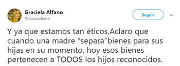 "Y ya que estamos tan éticos aclaro que cuando una madre 'separa' bienes para sus hijas en su momento, hoy esos bienes pertenecen a TODOS los hijos reconocidos", sentenció.