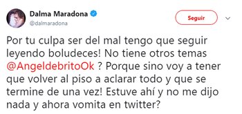 Lejos de terminar el tema, la descarga de Alfano motivó una nueva respuesta de Dalma, visiblemente molesta. "¡Por tu culpa ser del mal tengo que seguir leyendo boludeces! ¿No tiene otros temas @AngeldebritoOk? Porque sino voy a tener que volver al piso a aclarar todo y ¡que se termine de una vez! Estuve ahí y no me dijo nada y ¿ahora vomita en twitter?", disparó.
