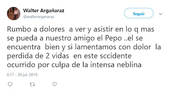 "Rumbo a Dolores a ver y asistir en lo que más se pueda a nuestro amigo El Pepo … él se encuentra bien y si lamentamos con dolor la pérdida de 2 vidas en este accidente ocurrido por culpa de la intensa neblina", escribió Walter Argañaraz, director comercial de SerTV Producciones, la productora de los hermanos Adrián y Pablo Serantoni.