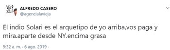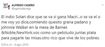 Las palabras del cantante, que brindó una entrevista en el ciclo Big Bang por El Destape Radio, no pasaron desapercibidas para Alfredo Casero, acérrimo defensor del gobierno actual. "El Indio Solari dice que se va si gana Macri… 'Se va él o me voy yo', dice, comiendo quesito Grana Padano y Johnnie Walker en la mesa de Barnes & Noble, New York", escribió el actor desde su cuenta de Twitter, donde tiene medio millón de seguidores.