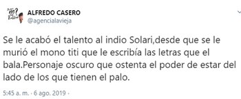 Luego aseguró que al ex líder de Los Redondos "se le acabó el talento desde que se le murió el mono tití que le escribía las letras", y lo calificó como un "personaje oscuro que ostenta el poder de estar del lado de los que tienen el palo".