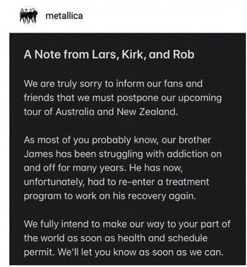 "Nos apena informar a nuestros fans y amigos que debemos posponer nuestra próxima gira por Australia y Nueva Zelanda", dice el primero de una serie de tuits firmados por Lars Ulrich, Kirk Hammett y Robert Trujillo, en referencia al tour que iniciarían el 17 de octubre. El anuncio de la internación de Hetfield llega justa en el día del aniversario de la muerte de Cliff Burton, bajista de Metallica de 1982 a setiembre de 1986.