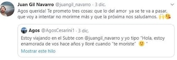 “Estoy viajando en el Subte con Juan Gil Navarro y yo tipo: 'Hola, estoy enamorada de vos hace años y lloré cuando te moriste”, le escribió a través de la red social. “¡Agos querida! Te prometo tres cosas: que lo del amor ya se te va a pasar, que voy a intentar no morirme más y que la próxima nos saludamos”, contestó el actor generando furor en Twitter.
