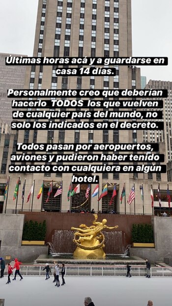 Así lo había indicado antes de tomar el vuelo a Buenos Aires. “Últimas horas acá y a guardarse en casa 14 días. Personalmente creo que deberían hacerlo todos los que vuelven de cualquier país del mundo. No solo los indicados en el decreto. Todos pasan por aeropuertos, aviones, y pudieron haber tenido contacto con cualquiera en algún hotel”, escribió en su cuenta de Instagram la bailarina junto a foto desde el Rockefeller Center.