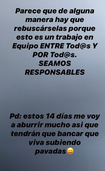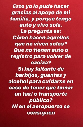 Luego, cuestionó que haya personas que no tienen la posibilidad que tuvo ella para mantener el aislamiento desde que salió del aeropuerto. “Esto yo lo pude hacer gracias al apoyo de mi familia, y porque tengo auto y vivo sola. La pregunta es: ¿cómo hacen aquellos que no viven solos? ¿Que no tienen auto o registro para volver de Ezeiza? ¿Si hay faltante de barbijos, guantes y alcohol para cuidarse en caso de tener que tomar un taxi o transporte público? Ni en el aeropuerto se consiguen. Parece que de alguna manera hay que resbuscárselas porque esto es un trabajo en equipo entre todos y por todos. Seamos responsables”, continuó.
