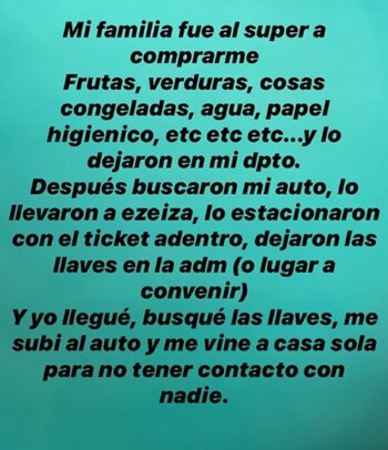 ¿Cuál fue la logística? “Mi familia fue al supermercado a comprarme frutas, verduras, cosas congeladas, agua, papel higiénico, etc etc, y lo dejaron en mi departamento. Después buscamos mi auto, lo llevaron a Ezeiza, lo estacionaron con el ticket adentro, dejaron las llaves en la administración (o lugar a convenir). Y yo llegué, busqué las llaves, me subí al auto y me vine a casa sola para no tener contacto con nadie”.