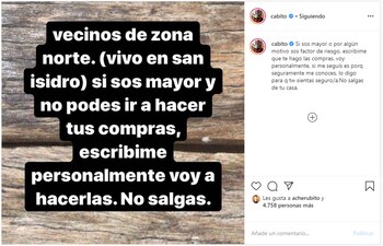 “Si sos mayor o por algún motivo sos factor de riesgo, escribime que te hago las compras. voy personalmente, si me seguís es porque seguramente me conoces, lo digo para que te sientas seguro/a. No salgas de tu casa”, le propuso Cabito Mass Alcántara en su cuenta de Instagram. En el posteo además contó que él es de la zona de San Isidro.