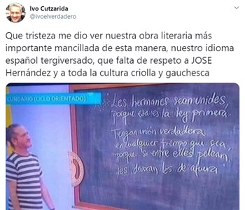“Qué tristeza me dio ver nuestra obra literaria más importante mancillada de esta manera, nuestro idioma español tergiversado, que falta de respeto a José Hernández y a toda la cultura criolla y gauchesca”, escribió el ex galán en su cuenta de Twitter.