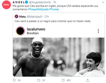 Al ver estos posteos, Ángel de Brito opinó en tono irónico: “Me gusta que Calu escriba en inglés porque USA estaba esperando sus comentarios”. El periodista y conductor de Los ángeles de la mañana había respondido a un mensaje irónico de uno de sus seguidores de Twitter: “Calu sacó a pasear a un negro para mostrar que no hacen nada”.