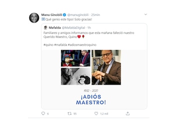 En las redes sociales, figuras del mundo del espectáculo, la cultura, el deporte y la política expresaron su dolor por la partida de Quino y lo recordaron con cariño. “Quino, ¡muchas gracias! Abrazo a tu familia”, escribió Verónica Lozano. Mientras que Manu Ginobili señaló: “¡Qué genio este tipo! ¡Solo gracias!”.