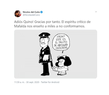 Del ámbito de la política, Santiago Cafiero homenajeó al querido artista: “Gracias Quino. Por el arte y el compromiso. Tu inmensa obra estará siempre presente en la historia argentina y en la memoria colectiva de quienes la disfrutamos. Hasta siempre, maestro”. Por su parte, Nicolás del Caño afirmó: “¡Adiós Quino! Gracias por tanto. El espíritu crítico de Mafalda nos enseñó a miles a no conformarnos”.