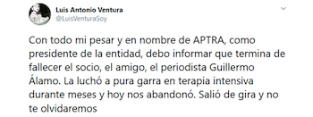 En Twitter, Luis Ventura expresó su pesar por la triste noticia: “Con todo mi pesar y en nombre de APTRA, como presidente de la entidad, debo informar que termina de fallecer el socio, el amigo, el periodista Guillermo Álamo. La luchó a pura garra en terapia intensiva durante meses y hoy nos abandonó. Salió de gira y no te olvidaremos”.