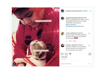 Mientras el Diez continúa internado en la Clínica Olivos tras haber sido intervenido quirúrgicamente, el menor de los Maradona lo espera ansioso para poder jugar juntos y con su perrita Lola y lo demostró con una tierna postal que compartió a través de sus redes sociales.