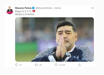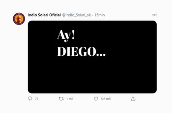 Por su parte, el Indio Solari publicó en Twitter una imagen en negro con la leyenda “¡Ay! Diego”. Mientras que la cantante Soledad también hizo una reflexión por la triste noticia: “De los seres humanos podemos decir mil cosas... Somos imperfectos... Pero no es posible negar que Maradona se convirtió en un símbolo argentino”.