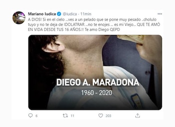 La humorista Fátima Florez también expresó sus sentimientos por la trágica muerte del ex de Claudia Villafañe: “Se nos fue el hijo de todos, el hermano de todos, el amigo de todos, el ídolo de todos, el héroe de todos, quien nos diera la mayor alegría deportiva y la ‘pequeña gran revancha’ a todos los argentinos”. Por su parte, Mariano Iúdica señaló: “¡A Dios! Si en el cielo ves a un pelado que se pone muy pesado, cholulo tuyo y no te deja de idolatrar, no te enojes, es mi viejo que te amó en tu vida desde tus 16 años. Te amo Diego. QEPD”.