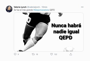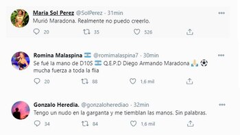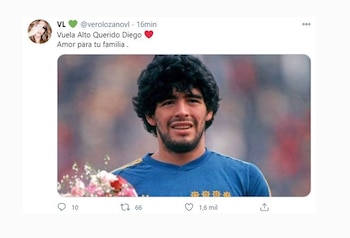 Además, la conductora Elizabeth Vernaci manifestó: “Hoy nos morimos todos un poco”. La cantante Valeria Lynch aseguró: “Se fue el más grande #diegomaradona QEPD”. La periodista Connie Ansaldi escribió: “Maradona vivió como quiso. Y así se fue. Inolvidable jugador. El mejor. QEPD”. Mientras que Nacha Guevara lo recordó con cariño y agradecimiento: “De la villa a la gloria. Pensamos que nunca te ibas a morir Diego. Pero la muerte es siempre una sorpresa. Con vos se va una época, una leyenda, un mito. Gracias por tu vida única, valiente y provocadora”.