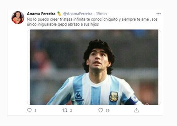 “Creí que el Diego era inmortal. ¡Qué triste! Mi pésame a su familia, a mi país y a los incondicionales que estuvieron a su lado, ¡muy duro! #¡Gracias Diego, te amamos!”, escribió Moria Casán en su cuenta oficial de Twitter. Susana Giménez publicó una imagen con él y aseguró: “El mundo llora tu partida, Diego querido. En este espantoso año era lo último que nos faltaba. Te encontrarás con tus seres queridos y por fin tendrás paz…”