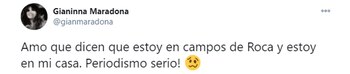 Por otra parte, unos minutos antes de publicar este tweet, la hija de Claudia Villafañe hizo otro descargo en esa misma red social. “Amo que dicen que estoy en campos de Roca y estoy en mi casa. Periodismo serio!”, escribió. El lugar al que hace referencia es el country donde residía su padre en Brandsen, justo donde quedó estacionado uno de los autos de alta gama que tenía el campeón del mundial 86, un BMW M4 coupé que el ex DT de Gimnasia usaba para llegar a los entrenamientos. Cabe destacar que ayer se inició la entrega de bienes de la colección de lujo de su padre, que incluye siete vehículos y una moto que fueron llevados en grúas hasta la puerta del estudio de Sebastián Baglietto, administrador de la herencia. Al parecer, la intención de ese tweet era desmentir su presencia en ese lugar. El jueves comenzó el traspaso formal de los bienes a manos de Baglietto, quien se reunió Mauricio D’Alessandro, abogado de Matías Morla, último apoderado del ex capitán del seleccionado albiceleste. Y ayer por la mañana el letrado tuvo un cara a cara con la jueza.