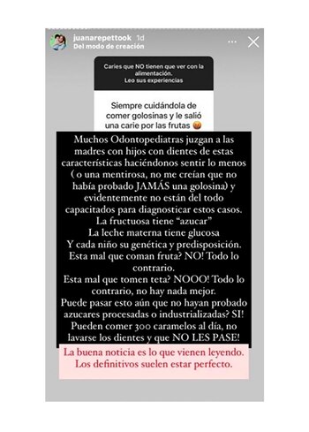 En otra historia, agregó: “Yo probé de todo, el gran acierto fue caer en una odontopediatra amorosa, que no juzga y acompaña. La realidad es que en mi experiencia no hay mucho por hacer cuando son tan pequeños, más que higienizar muy bien para proteger los dientes sanos e inculcar el hábito del correcto lavado de dientes”.