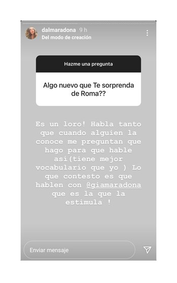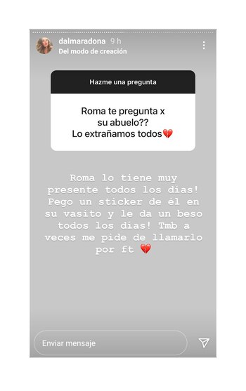 ¿Si su niña pregunta por su abuelo? “Roma lo tiene muy presente todos los días. Pegó un sticker de él en su vasito y le da un beso todos los días. También a veces me pide de llamarlo por facetime”, reconoció Dalma. Y contó que es lo que hoy la sorprende de su hija. “¡Es un loro! Habla tanto que cuando alguien la conoce me pregunta qué hago para que hable así (tiene mejor vocabulario que yo). Lo que contesto es que hablen con @giamaradona que es la que la estimula”, dijo en referencia a su hermana, a la que definió como “el mejor regalo de mi vida”.