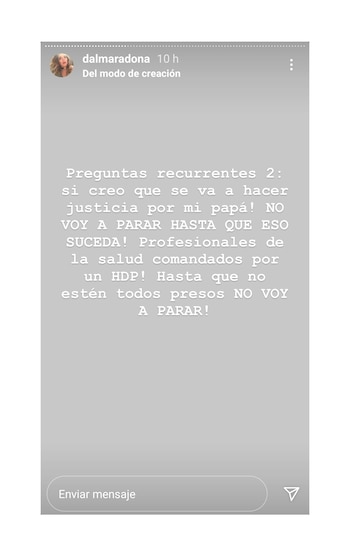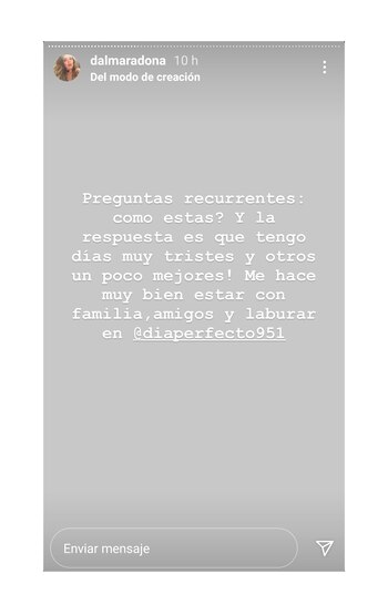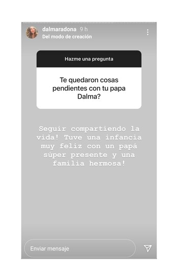 Ya pasaron tres meses del fallecimiento de Diego Maradona. Pero la realidad es que, hasta ahora, ninguno de sus deudos ha podido elaborar el duelo. Primero fue el caos del velorio, después la investigación por las causales de muerte, más tarde los conflictos ligados a la sucesión...En ese marco, Dalma Maradona decidió responder a través de su cuenta de Instagram las preguntas de sus seguidores. Y, una vez más, remarcó que hay muchos puntos de la relación con su padre que la gente no conoce.