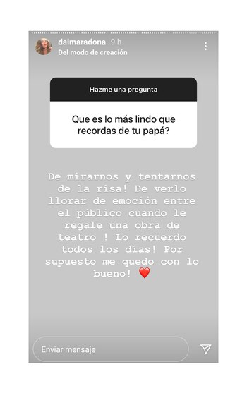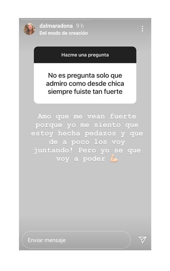 Entonces, alguien le dijo que admiraba su fortaleza y Dalma contestó: “Amo que me vean fuerte porque yo me siento que estoy hecha pedazos y que de a poco los voy juntando. Pero yo sé que voy a poder”. ¿Si le quedaron cosas pendientes con Maradona? “Seguir compartiendo la vida. Tuve una infancia muy feliz con un papá súper presente y una familia hermosa”, dijo.