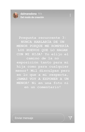 Por último, Dalma se refirió a Sueño Bendito, la serie de Amazon sobre la vida de Diego que tiene fecha de estreno prevista para los próximos meses. “Opino que es una vergüenza que mi papá jamás haya hablado con nadie para que sacaran testimonios de él. Y que la gente contratada para contar la historia (me da asco) no tiene idea de nada de la vida real de mi papá”, concluyó.