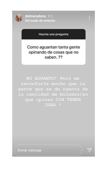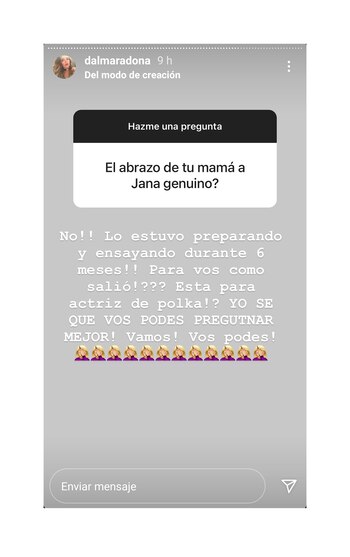 “¿Cómo aguantan tanta gente opinando de cosas que no saben?”, le consultaron. Y la actriz no dudó en responder: “¡No aguanto! Pero me reconforta mucho que la gente se de cuenta de la cantidad de boludos/as que opinan sin tener idea”. Y luego, se ofuscó cuando alguien le consultó si el abrazo de su madre a su hermana Jana, en el velorio de Maradona, había sido genuino. “¡No! Lo estuvo preparando y ensayando durante 6 meses. ¿Para vos cómo salió? ¿Está para actriz de Pol-ka? Yo sé que vos podés preguntar mejor. ¡Vamos! ¡Vos podés!”, contestó irónica.